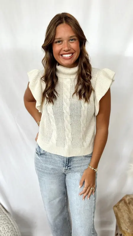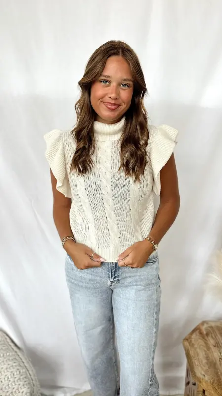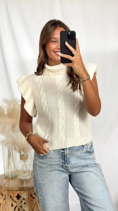 The Alessia Top is a cozy mock neck knit sweater with playful ruffle sleeves that add a flirty touch. Easy to dress up or down, this top brings a little extra style to your everyday look.