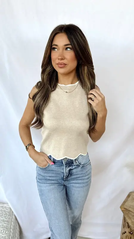The Ellis Top is a playful tank available in classic black and soft taupe, each accented with crisp white scalloped edging for a charming touch. Its simple design makes it a versatile favorite for layering or wearing solo, adding a fresh, fun twist to your everyday wardrobe.
