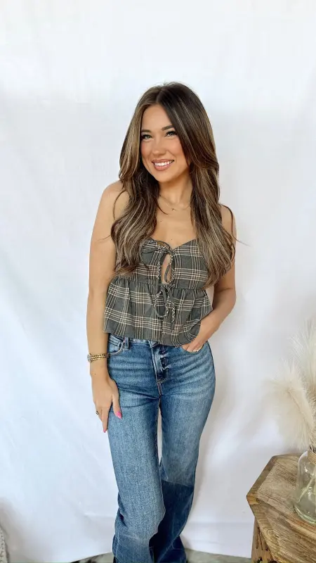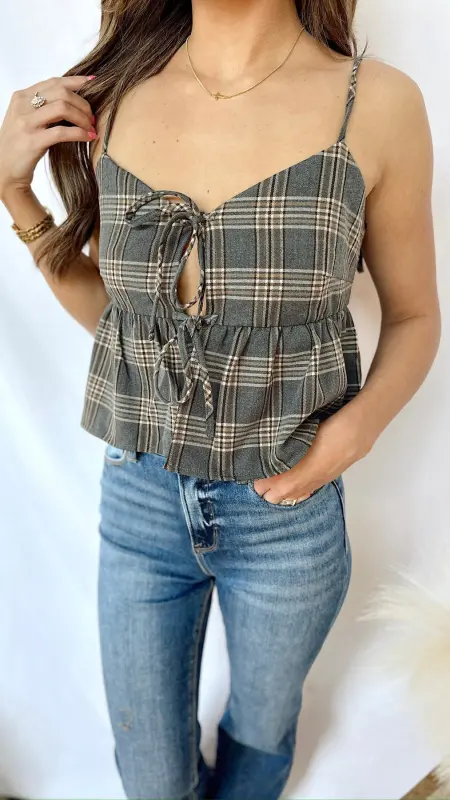 The Linnea Top is a playful plaid blouse featuring a cozy grey base with charming brown, white, and taupe stripes. Adjustable strap ties add a cute and customizable touch, making it easy to wear for any casual day out. Perfect for adding a bit of pattern and personality to your wardrobe!